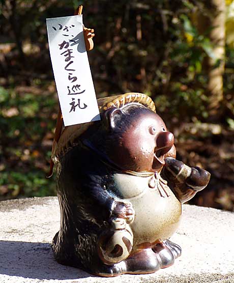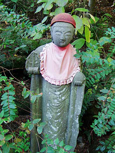 清楚な参道をしばらくいくと、本堂へつづく石段が。と、そこで、ふと右側に目がとまります。お地蔵さんかと思って通り過ぎそうになったのですが、手にしておられる錫杖(しゃくじょう)のあたまの部分の輪っかの中に、小さな十字が刻まれているではありませんか。どう見てもクルスです。地蔵さまの顔をつくづく眺めますというと、それは、まぎれもなくマリアさまにちがいありません。ひょっとして、いつのときにか隠れキリシタンのかたがたがひそかに、ここでお祈りしていたものでしょうか。