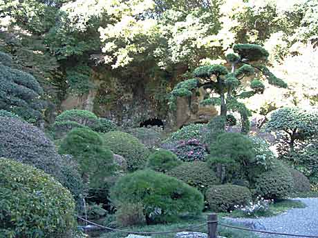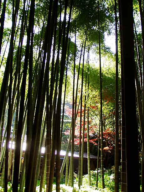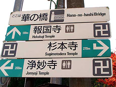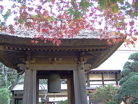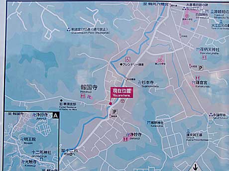杉本寺を出て、滑川ぞいの遊歩道を上流に向かいます。渓流には緋鯉や真鯉が身をくねらせ、岩場ではセキレイが2羽、なかよく遊びたわむれています。10分ほど歩くと、華の橋。なんと粋な名前じゃありませんか。その粋な小橋を渡って100メートルもいけば、「功臣山」の扁額のかかった報国寺の山門。