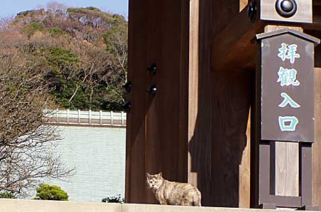 報国寺で大猫の話を思い出したあとだけに、驚きましたとも。しかし、この猫、なかなかの愛嬌もので、わたくしを見つけると妙(たえ)なる声を発しますというと、「やあ、いらっしゃい。さぁ、ついておいで」と言わんばかり、そそくさと門内へ導いてくれるではありませんか。もちろん独り合点ですが、「妙」の字のナゾが解けた思いがいたしました。これからは、せいぜい猫と仲良くさせてもらおうと心に決めました。