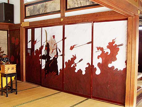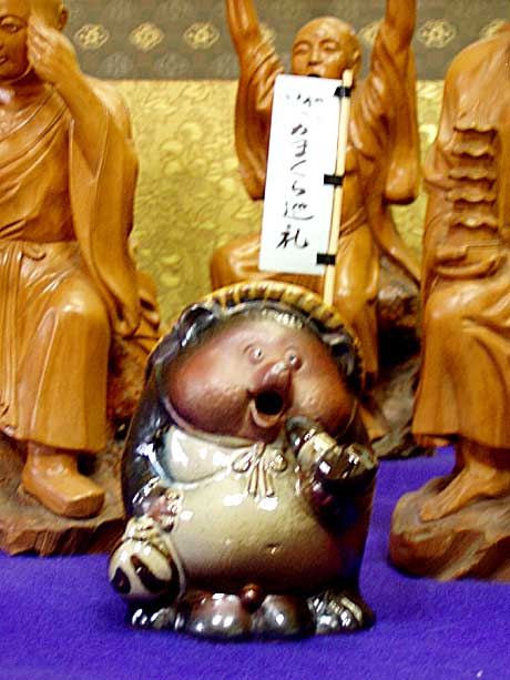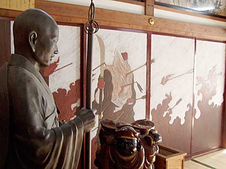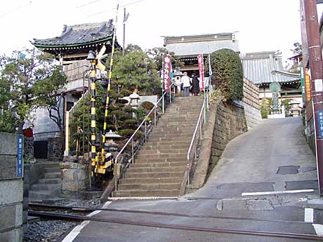 つい先だってから始まったNHK大河ドラマ『義経』にちなんで、源義経ゆかりの満福寺を訪ねましょう。腰越駅前の案内板にしたがって、ほんの5分。江ノ電が通過した踏切の遮断機があがると、目の前が山門へとつづく石段です。