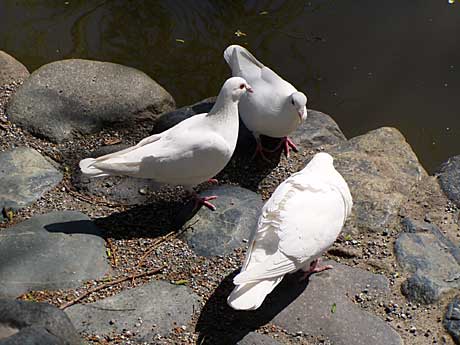 神社といえばハトはつきものですが、ここ源平池では、白いハトはおもに源氏池に集まり、平家池のほうには、ほとんど姿を見せません。源氏の白旗と「白鳩」が、奇妙に通じあっているのです。これは人智のおよばぬことですから、やはり、神社にいるハトは、神さまのつかいというのは間違いではなさそうです。