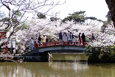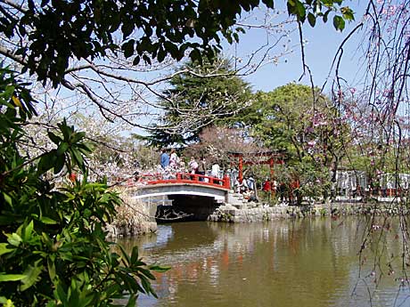 三の鳥居をくぐると、源平池にかかる太鼓橋。橋によって池は二分されており、右手の広いほうが「源氏池」、左手が「平家池」と呼ばれています。