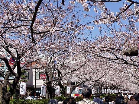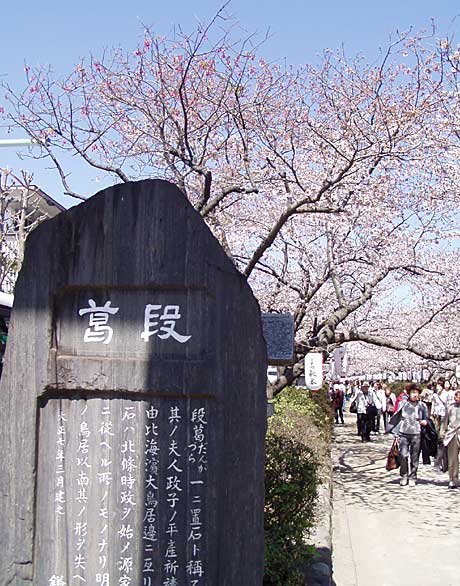 若宮大路には三つの鳥居があり、大路のほぼ中央部にある二の鳥居から八幡宮前の三の鳥居までの間にある一段高い遊歩道が段葛(だんかずら)。ごらんください、みごとな桜のトンネルでしょう。